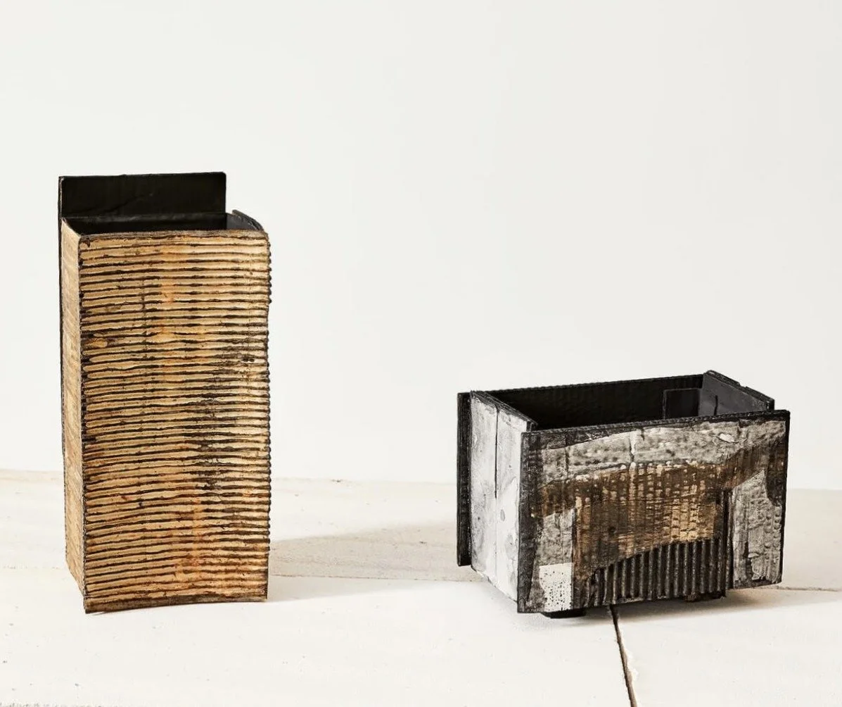 Lindy McSwan, 'Vessel Studies - Corrugated' 2020. Corrugated cardboard, pigments made from rust, quartz and charcoal, beeswax. Dimensions variable. Photographer: Bryony Nainby